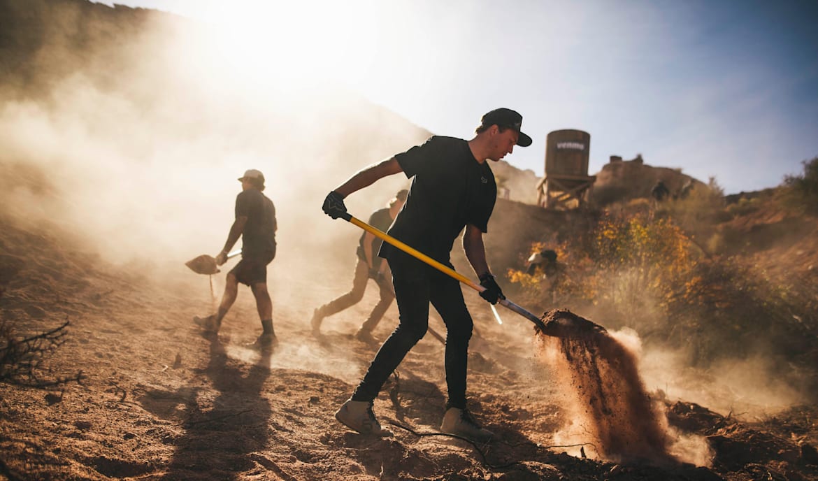 Райдер может привлечь к строительным работам команду из двух товарищей, которые помогут ему построить трамплины с использованием лопат и мешков с песком – электроинструменты и другие материалы задействовать не разрешено. Обычно на Red Bull Rampage даётся три дня, чтобы просто копать и строить, и еще четыре дня на то, чтобы сесть на велосипед и протестировать построенные трассы. Во время тестовых проездов райдеры могут продолжить копать и менять свои линии. Иногда спортсмены договариваются объединить части построенных трасс, чтобы таким образом сэкономить силы и ресурсы для копания.